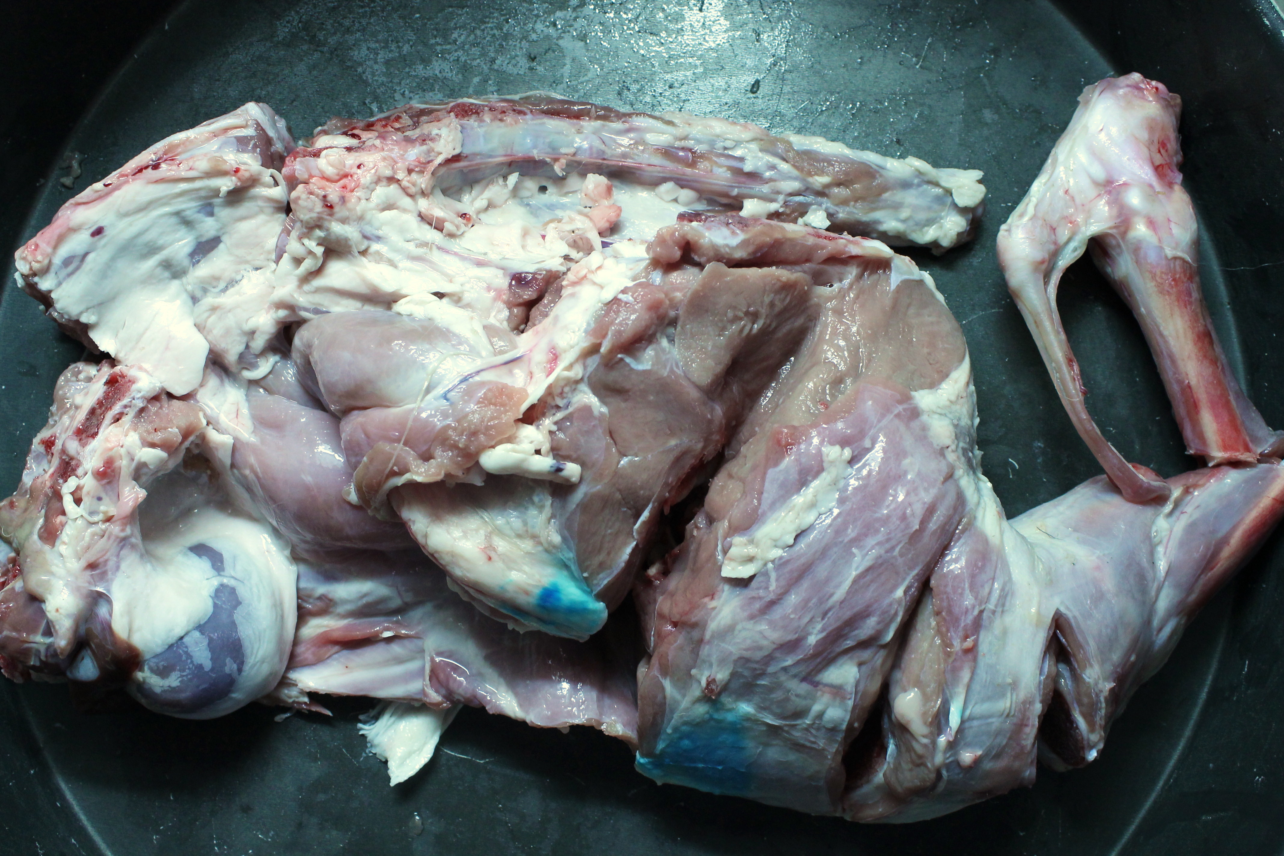 Wash the meat under running water to remove the small pieces of bones from the cutting. Place the meat on a tin with the skin-side down, do not dry. Add salt from both sides.