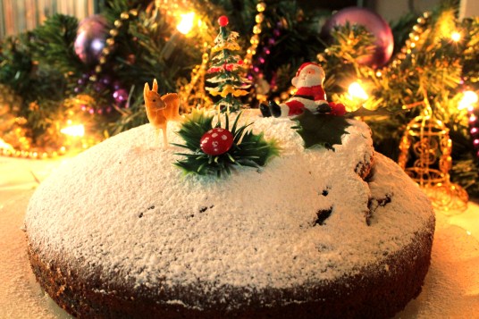 Let cool the cake, remove the baking tin and the baking paper and add the lucky coin from the down side of the cake. Dust a thick layer of powder sugar on top of the cake and decorate to your taste.