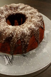 Prepare the chocolate icing as indicated on the package. Pour over the cake and sprinkle with some coconut flakes.