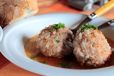 Form the meat-rice-mixture form balls (appr. size of a tennis ball) and cook in the broth on medium heat for appr. 30 minutes.
