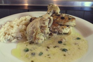 Deglaze with wine and let cook for appr. 5 minutes. Then add the chicken broth and cover with a lid. Let cook for 45 minutes or until meat is tender.