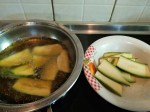 In a frying pan add enough oil so that the vegetable slices can “swim” while frying. Fry each slices one by one for appr. 3 minutes, flipping once or twice, until slightly brown.
