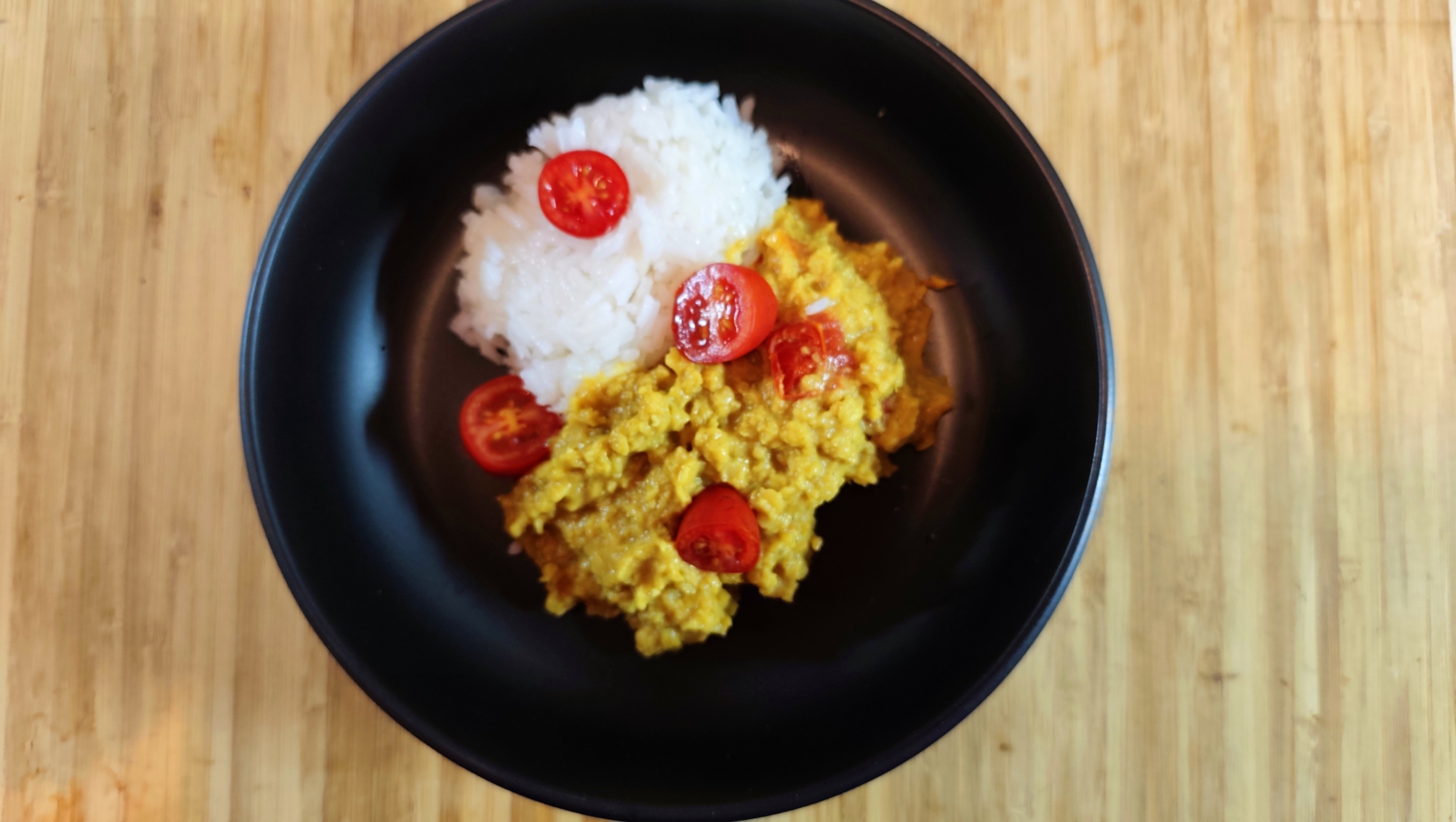 Add the cumin, cinnamon and curry powder and let roast for one more minute. Add the coconut milk, the vegetable broth, the tomatoes and the lentils.