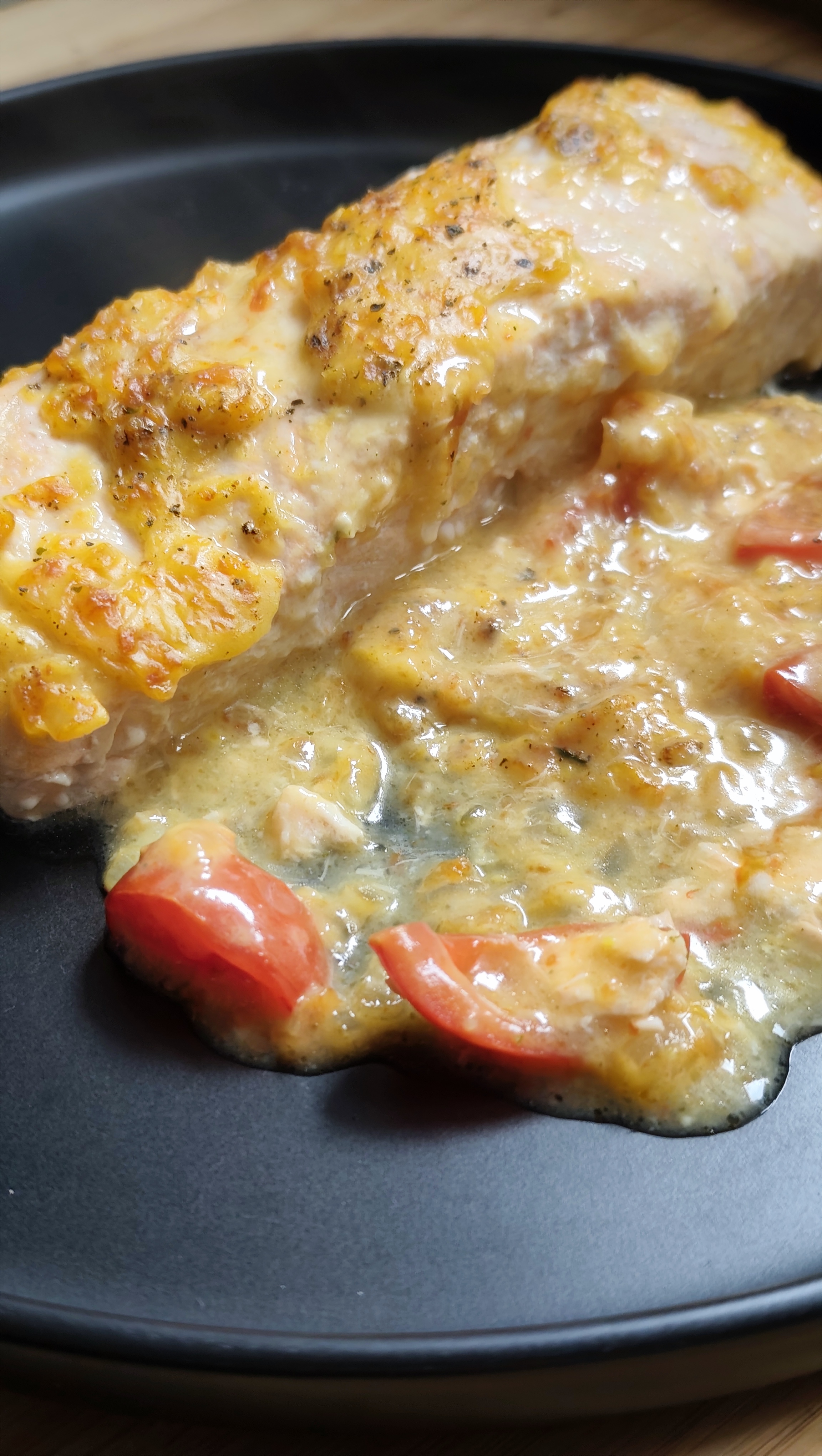 Drizzle the salmon with lemon juice and season with lightly salt. Place it in an ovenproof dish. Distribute the cherry tomatoes and the sauce evenly over the salmon.